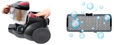 • تتميز مكنسة Bag Less ماركة LG بفلتر الكربون hepa الذي يشفط 99.95٪ من الجسيمات المجهرية والأتربة الناعمة.