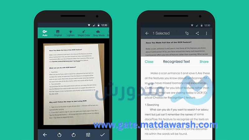 - المميزات: التعرف الضوئي على الحروف (OCR)، تصحيح الزوايا تلقائيًا، تحويل إلى PDF.